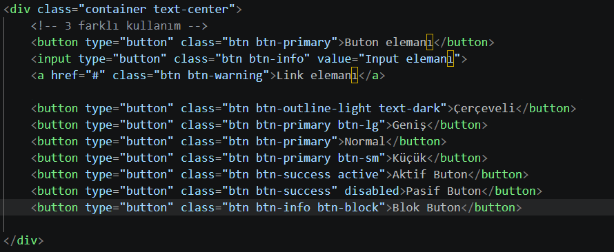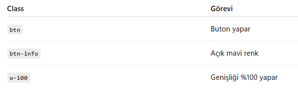 <button type=”button” class=”btn btn-info w-100″>Blok Buton</button>