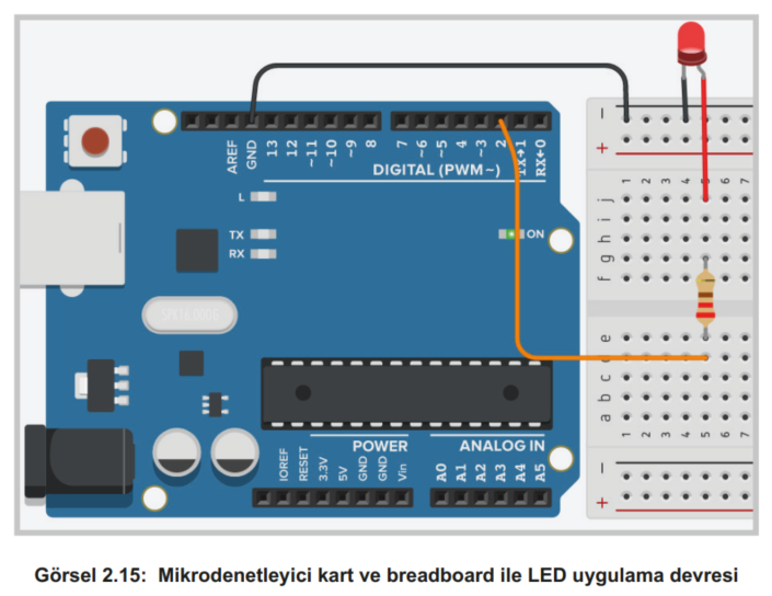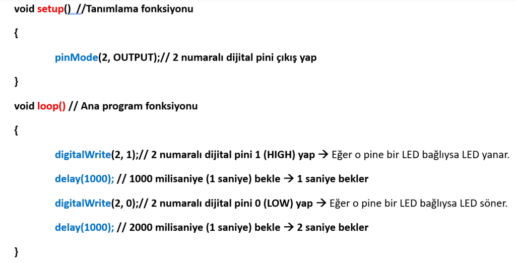 Bu işlem loop() fonksiyonu içinde olmalıdır, çünkü LED’in yanıp sönmesi için komutların sürekli tekrarlanması gerekir.